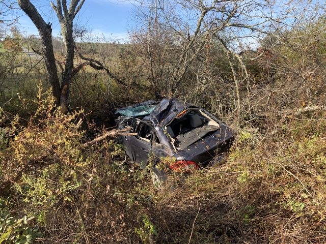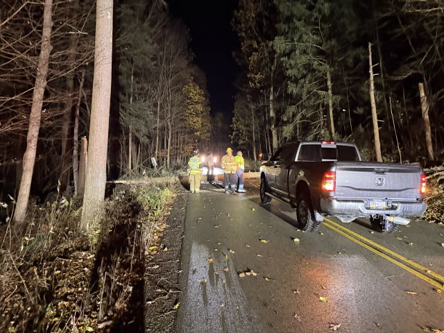 0654am Crews responded to a tree down blocking the road. Chief arrived and found the tree and also one vehicle that had struck the tree. Chief had Ems dispacthed for the driver who was transported to the hospital for observation. The tree was cut and removed and all crews/units cleared. 2025-358